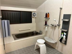 The quadruple room provides air conditioning, tatami, as well as a shared bathroom featuring a bath and a bidet. The unit offers 4 futons.