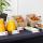 A buffet breakfast with regional jams and treats is served daily. The bright breakfast area is decorated with metal lamps and tables, and interior plants.
