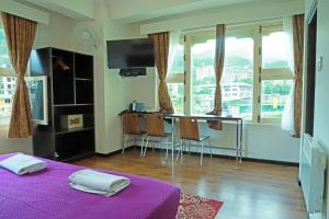 The quadruple room includes a private bathroom, well-fitted with a bath, a shower, a bidet, a hairdryer and slippers. The quadruple room offers a flat-screen TV, a tea and coffee maker, a wardrobe, a safe deposit box as well as mountain views. The unit offers 2 beds.
